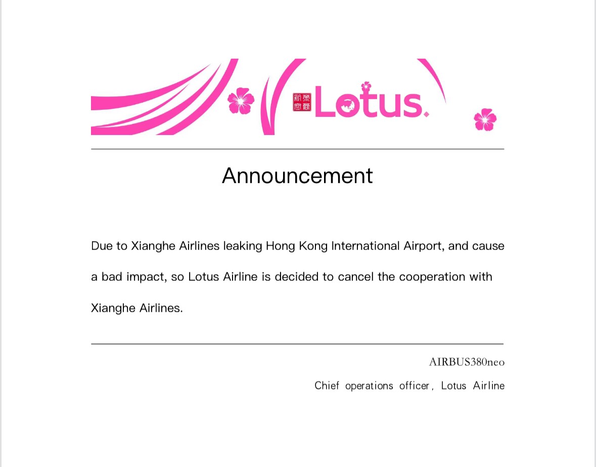 由於祥和航空盜取使用LOGIC的香港國際機場,經過董事會的決議,我們將停止與祥和航空的合作。